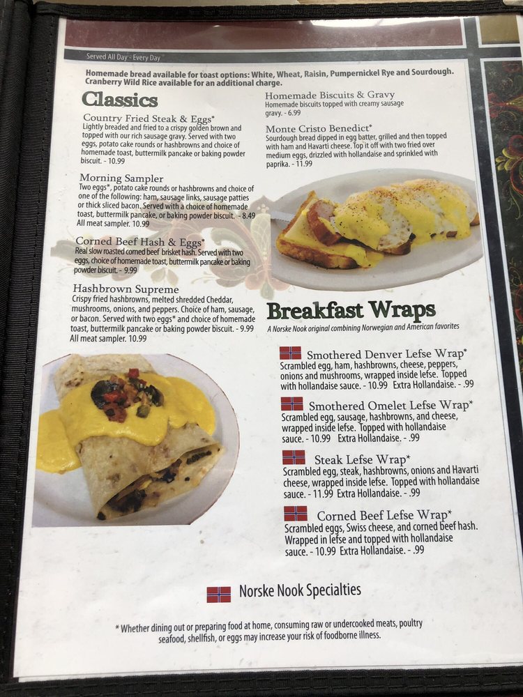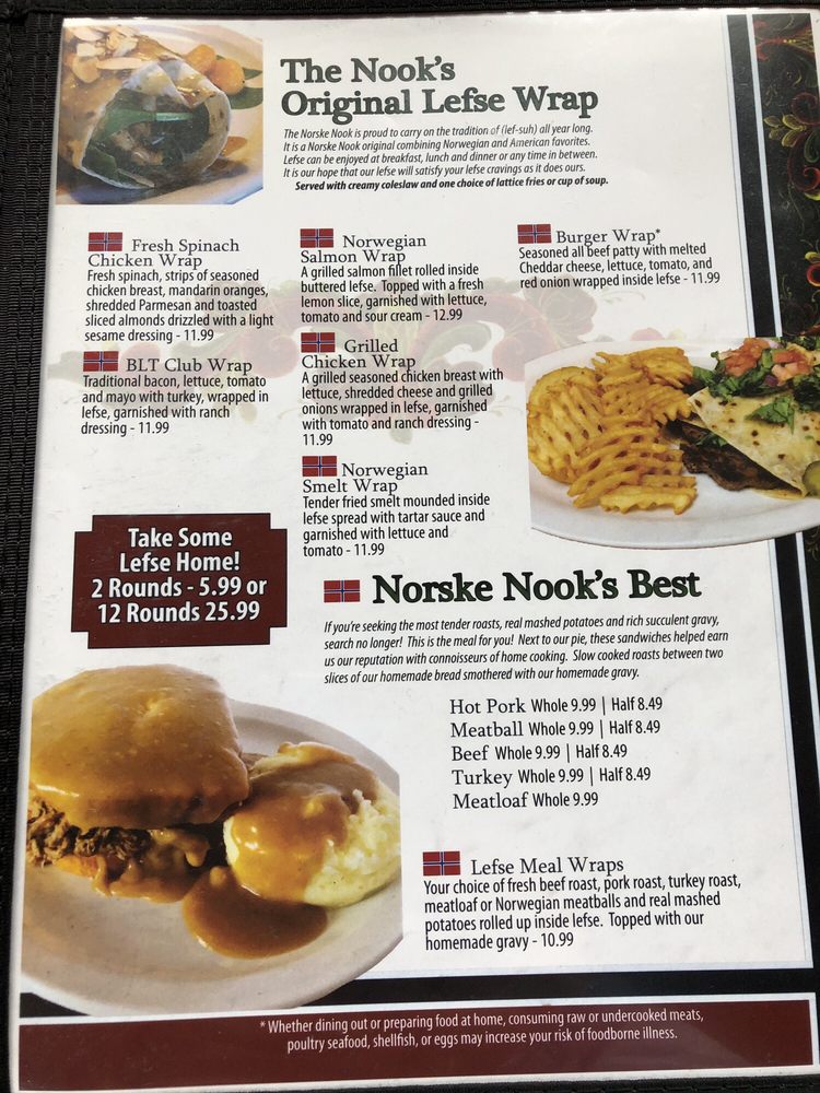 Norske Nook, a traditional American restaurant located in Rice Lake, WI, offers a variety of delicious options for breakfast, lunch, and dessert. Known for their Swedish pancakes and homemade pies, this place has garnered rave reviews from customers. The atmosphere is described as family-like, with friendly service. Highlights include perfectly baked and fried dishes like fried cod with chips, fresh salads, and mouthwatering blueberry crusted pie. The menu features items made from scratch, such as Swedish meatballs and pork sandwiches smothered in gravy. Despite the limited options for vegans, the dishes are praised for their quality and taste. The restaurant also takes COVID precautions seriously by implementing social distancing measures. If you're a pie enthusiast, Norske Nook is a must-visit spot for a comforting, delicious meal.